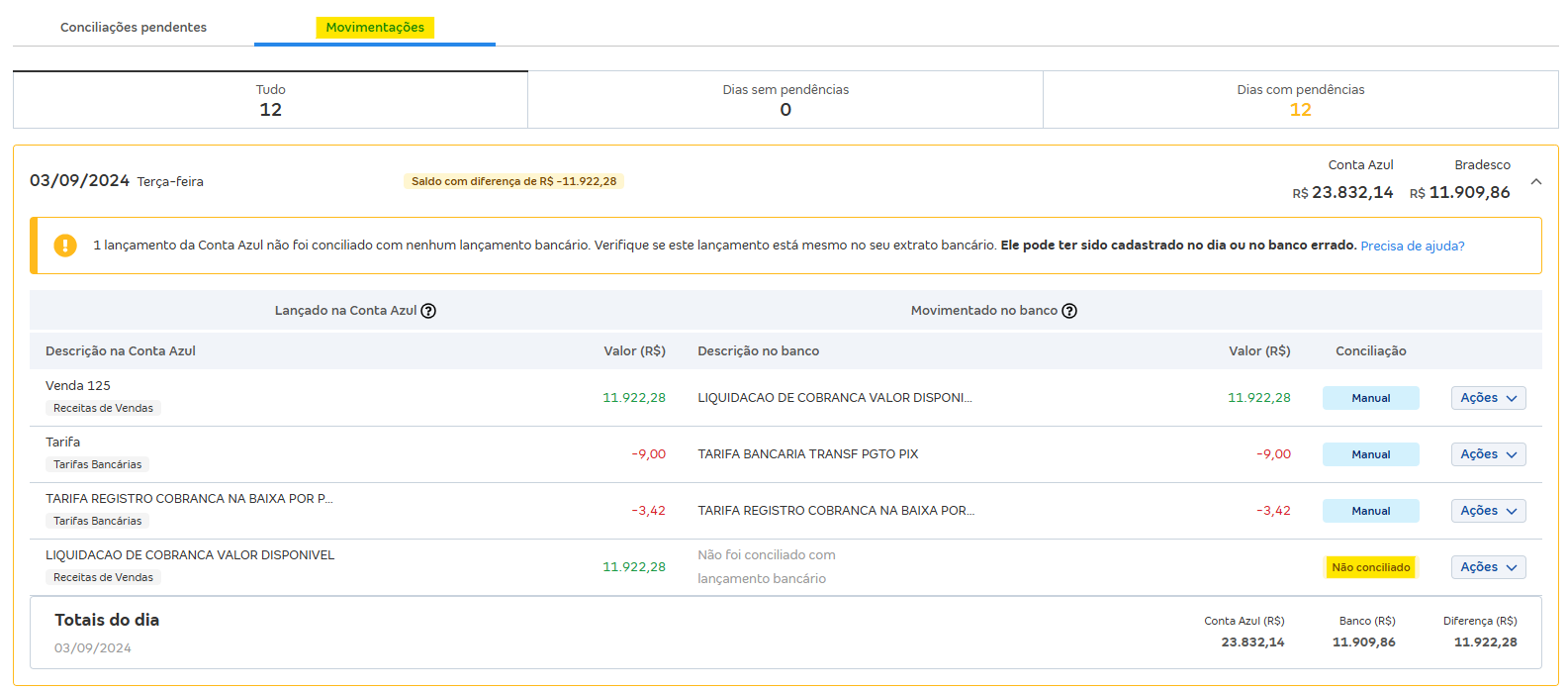 O saldo do dia diverge do banco, há baixa sem linha correspondente no extrato ou existe aviso de diferença em Movimentações.