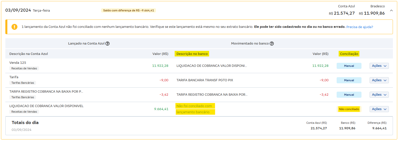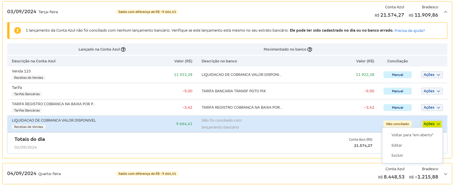 Valide o saldo final do dia para confirmar a correção.