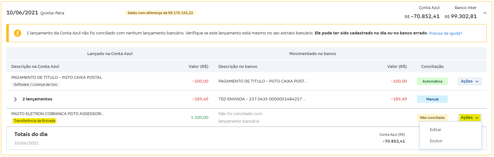 - Se o lançamento for uma transferência, você poderá escolher apenas entre Editar ou Excluir.