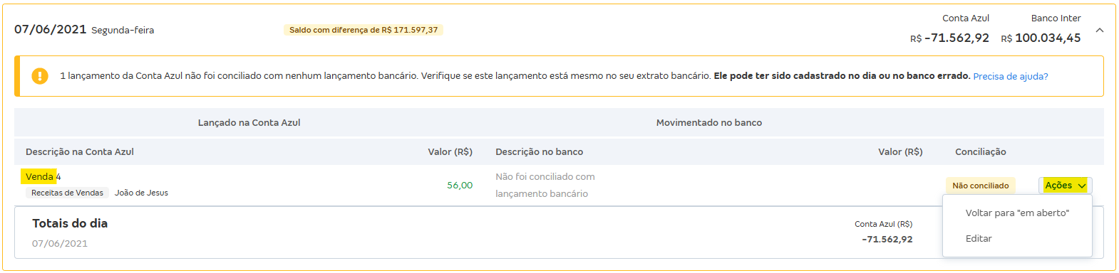 Para corrigir este lançamento baixado incorretamente, clique em Ações e escolha entre Voltar para "em aberto", Editar ou Excluir.