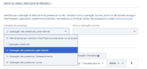 - Em Dados da Venda (Indicador de Presença), selecione o Indicador de Presença e Como a Operação ocorreu.